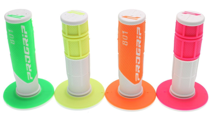 Zweifarbige "Double Density" Griffe von Progrip. Die Basisfarbe der Griffe ist in diesem Fall Weiß mit entsprechenden Neon-farbigen Akzenten.